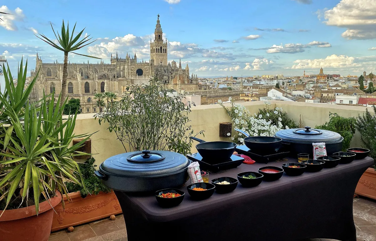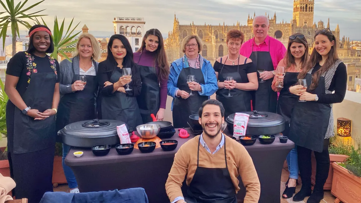 Immerse yourself in the heart of the city with our paella class, set in a picturesque outdoor setting surrounded by timeless beauty.